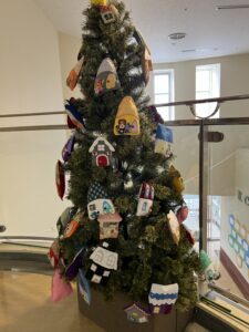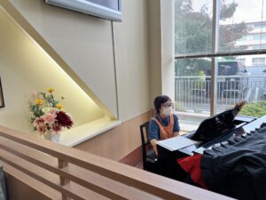 総合待合ホールに癒しの音楽を クリスマス飾りがいっぱいのホールにボランティアによる優しいピアノ演奏が響き、会計待ちの方々のこころを和ませてくれました。 2階には今年の手芸グループのテーマの一つ”家”がたくさん飾られています。